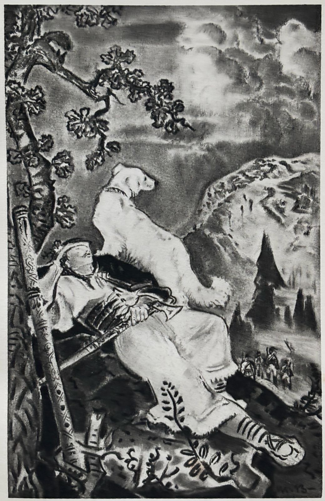 Signované v tlači, rámované. Ilustrácia k básni Andreja Sládkoviča Detvan vydanej Maticou Slovenskou v roku 1943.