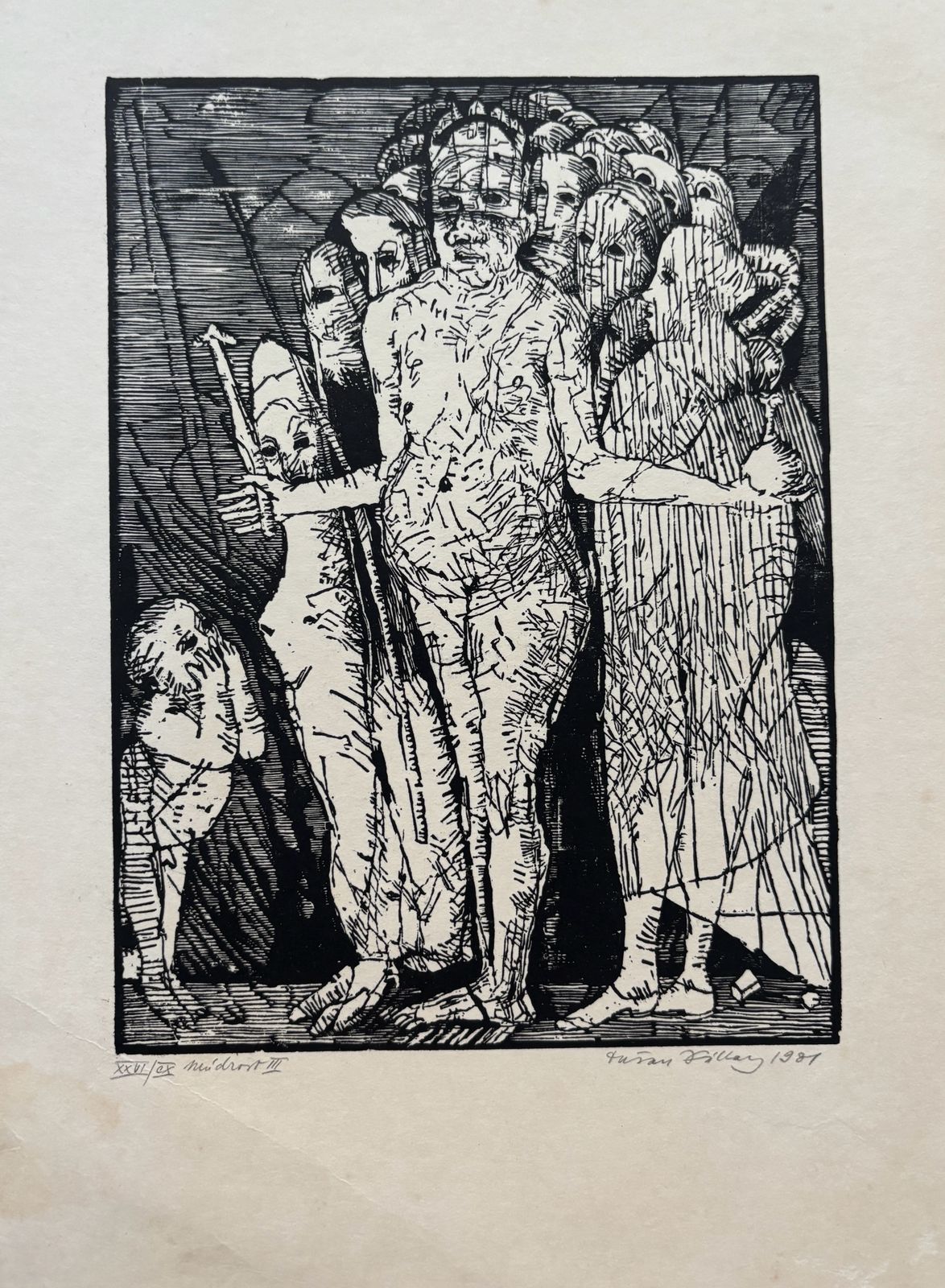 Ľavý roh papiera prehnutý, nezasahuje priamo do grafiky. Nerámované