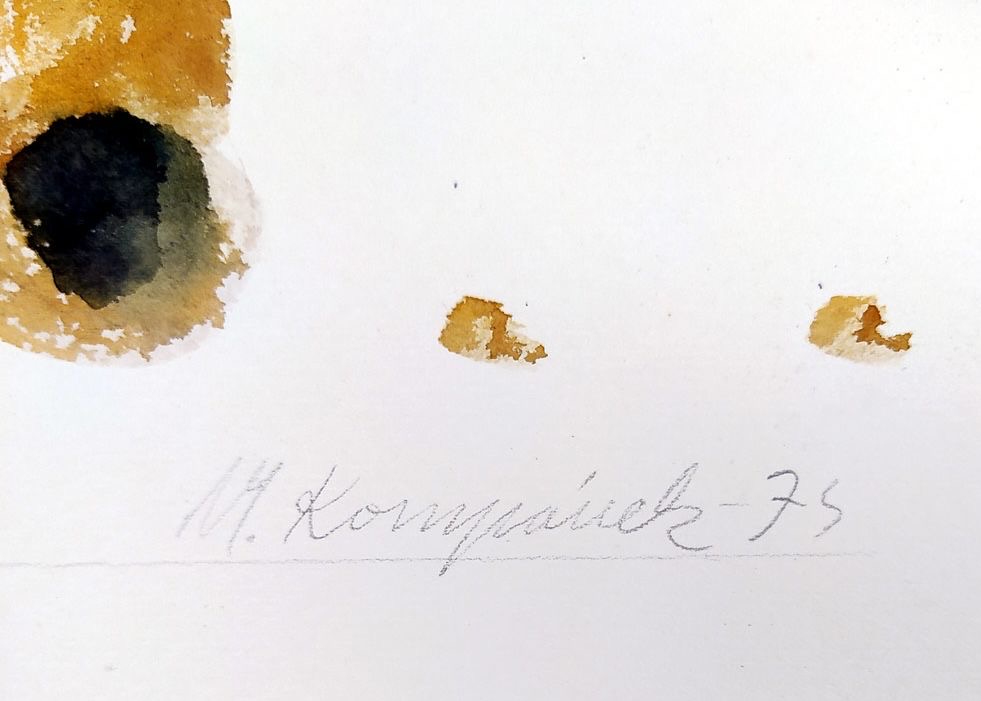 Vľavo hore ohnutý roh, rámované, signované vpravo dole ceruzkou “V. Kompánek 74”